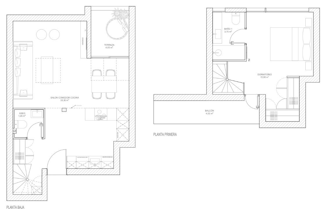 Situado en una cuarta planta, el dúplex se distribuye en dos niveles. En la primera planta se encuentra un amplio salón-comedor con cocina integrada, un espacio abierto y funcional ideal tanto para el día a día como para recibir invitados. Grandes ventanales aportan abundante luz natural y dan acceso a una terraza privada, perfecta para desayunar al aire libre o relajarse al final del día. En esta planta también hay un aseo de cortesía.