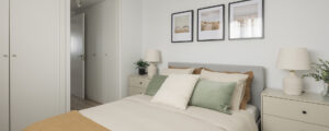 Armarios empotrados, baño en suite en el dormitorio principal y cocinas totalmente amuebladas de forma moderna y elegante, son algunos de los acabados interiores de esta promoción de pisos de obra nueva en Valencia.