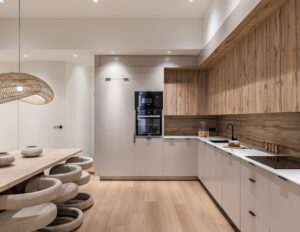 La cocina–comedor, concebida como eje social del hogar, presenta un diseño funcional y elegante con acabados en madera, tonos neutros y formas orgánicas. Su distribución amplia y equilibrada lo convierte en un espacio perfecto para el día a día.