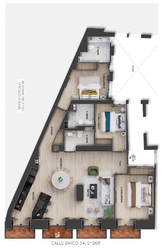 Cuenta con tres dormitorios y tres baños completos, proporcionando comodidad y privacidad en cada estancia. Los interiores han sido diseñados con una paleta neutra y materiales de calidad, creando un ambiente equilibrado y acogedor.
