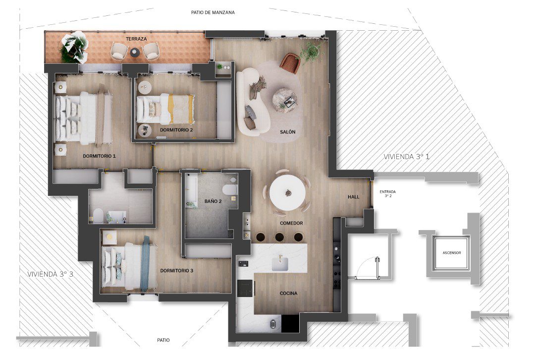 La distribución contempla tres dormitorios y dos baños completos, pensados para garantizar comodidad y versatilidad. La cocina equipada se integra con coherencia en el conjunto, priorizando funcionalidad y estética.