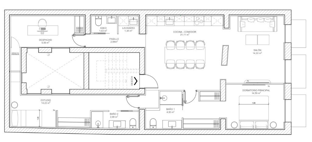 Las áreas sociales son espectaculares, pensadas como un verdadero punto de encuentro. El acogedor salón y el comedor se integran en un diseño que juega con contrastes y transparencias, conectando con la energía de la ciudad. La luz natural inunda el espacio gracias a sus tres balcones a la calle. Las ventanas cuentan con doble acristalamiento, lo que garantiza un excelente aislamiento acústico frente al bullicio del centro de Madrid.La cocina, de diseño moderno, queda perfectamente integrada en este espacio, ofreciendo funcionalidad y estilo. Además, la vivienda cuenta con un práctico aseo de cortesía y una zona de lavandería discreta y funcional.
